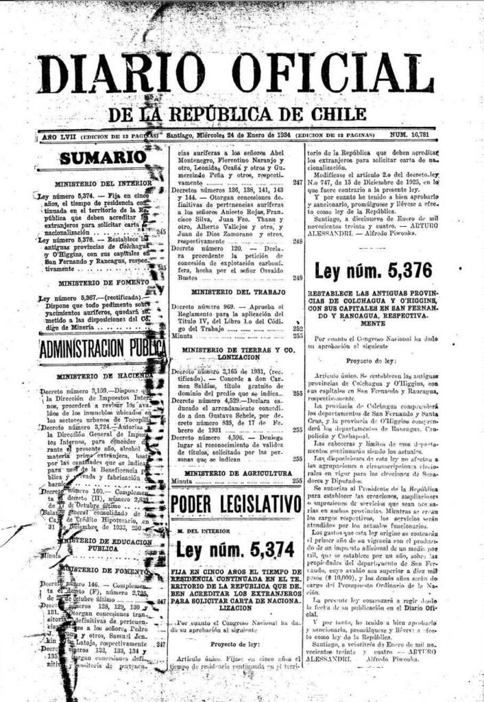 90 años de la Ley N.° 5.376 que restauró la provincia de Colchagua