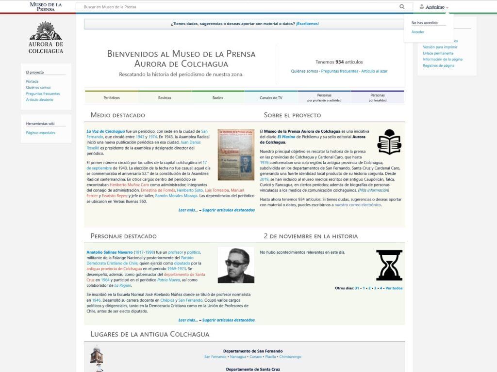 Este proyecto nació en 2018 a través del diario El Marino, con el objetivo de preservar y celebrar nuestra identidad local. En marzo de 2020, el “Museo de la Prensa” se transformó en la Enciclopedia Colchagüina, ampliando su enfoque a todos los aspectos relevantes de nuestra zona.