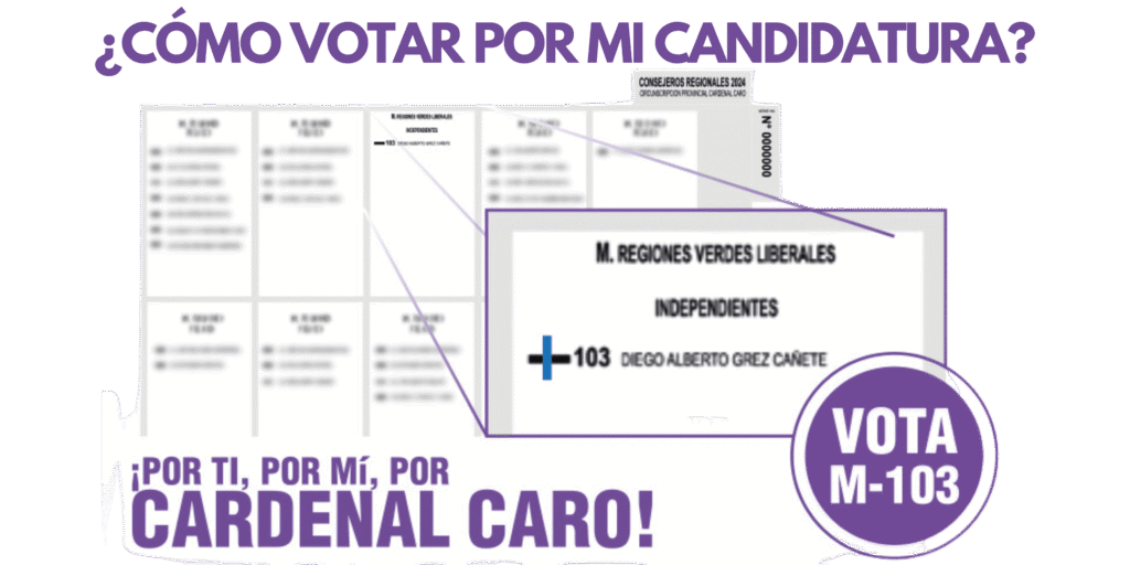 En la papeleta figurará así: “M. PACTO REGIONES VERDES LIBERALES. INDEPENDIENTES. 103 DIEGO ALBERTO GREZ CAÑETE”.