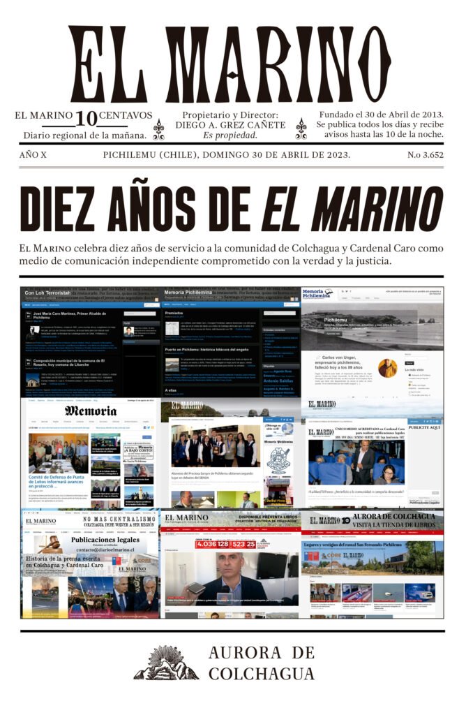 Obra conmemorativa publicada para celebrar el décimo aniversario del diario El Marino, fundado en Pichilemu el 30 de abril de 2013. El texto ofrece un recorrido histórico detallado que no solo abarca la trayectoria y evolución de este medio —desde sus inicios digitales como Memoria Pichilemina hasta su consolidación como un diario independiente comprometido con la verdad y el rescate patrimonial—, sino que también presenta una crónica exhaustiva de la prensa escrita en las provincias de Colchagua y Cardenal Caro, remontándose a los orígenes del periodismo local en el siglo XIX. Además de documentar hitos institucionales, proyectos editoriales y colaboraciones, el libro destaca por su labor de preservación de la memoria histórica de la región, incluyendo capítulos sobre antiguos periódicos de comunas como San Fernando, Curicó y Santa Cruz, y ofreciendo un resumen de los acontecimientos más relevantes de la década 2013-2023.