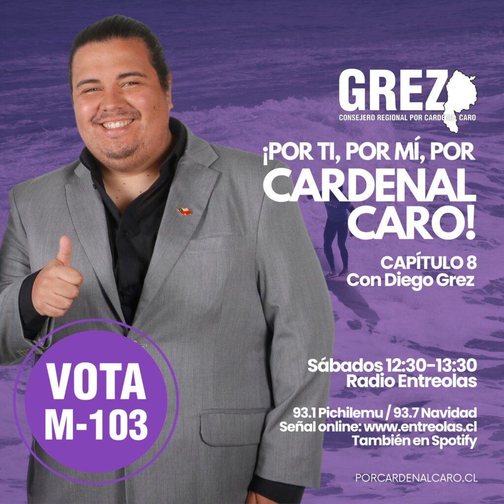 En su primera temporada, “¡Por ti, por mí, por Cardenal Caro!” profundizó en la candidatura al Consejo Regional de O’Higgins y en los temas clave de cada comuna de la provincia Cardenal Caro. Diego Grez presentó propuestas y necesidades urgentes de Pichilemu, Navidad, La Estrella, Litueche, Marchigüe y Paredones. En su segunda temporada, continuará explorando estos temas junto a la contingencia local, regional y nacional, manteniendo a los cardenalinos informados y conectados con los asuntos que impactan su día a día y su desarrollo.