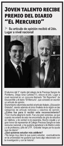 Resumen: Nota sobre el premio obtenido en el concurso Sé Reportero del diario El Mercurio y el portal Educarchile en 2011.